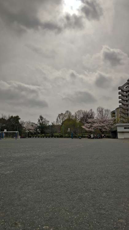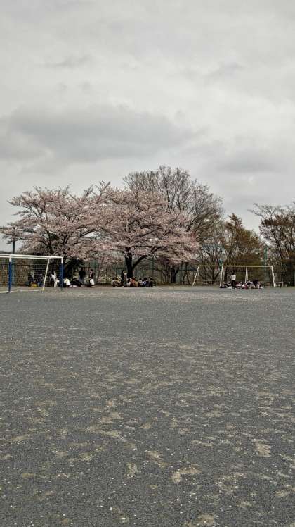 (桜の木の下で、2年生以上の6クラスがスタートしました)