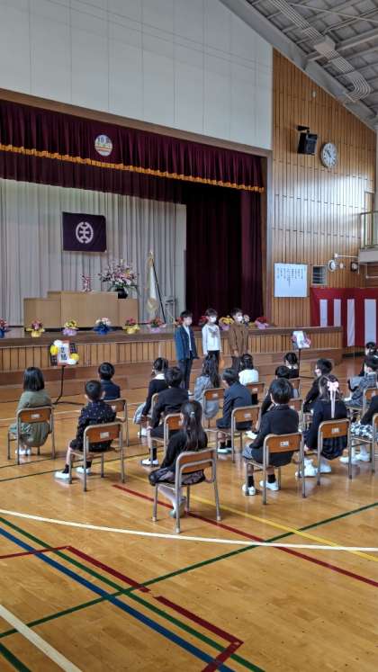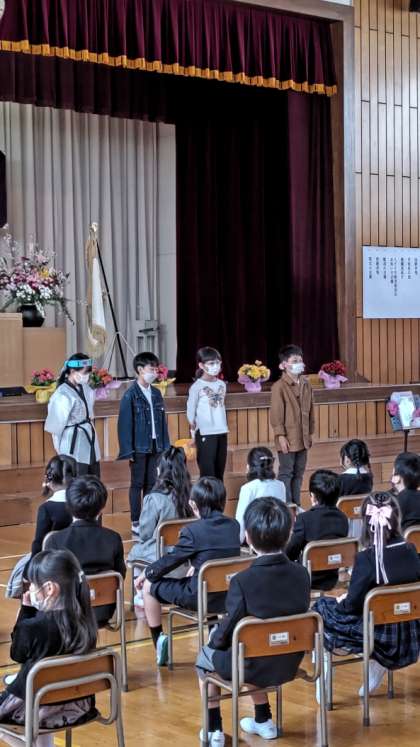 (6年生代表児童の歓迎の言葉です。下柚木小のマスコット「しもたろう」もいます)