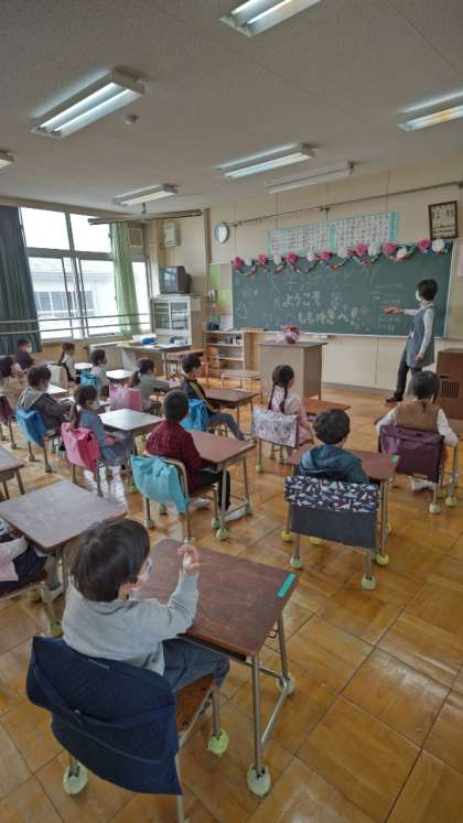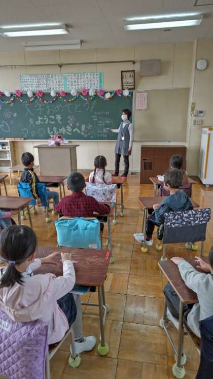 (授業が始まりました。1年生は朝の準備の仕方を勉強しています)