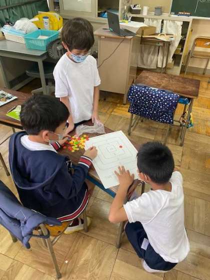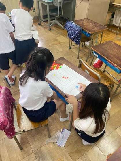 おはじきゲームをしながら楽しく計算をしています。