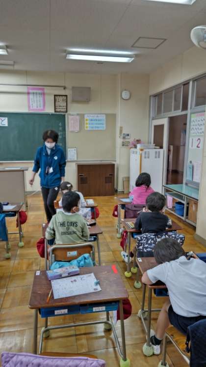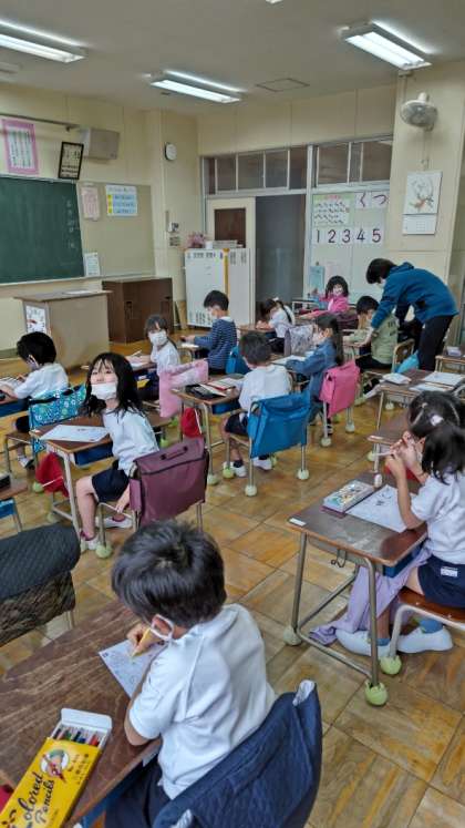 [1年生国語]1組です。こちらもひらがなのワークシートをしています。私が教室に入ると「あっ校長先生だあ」と話しかけてくれます。