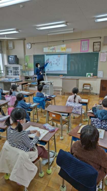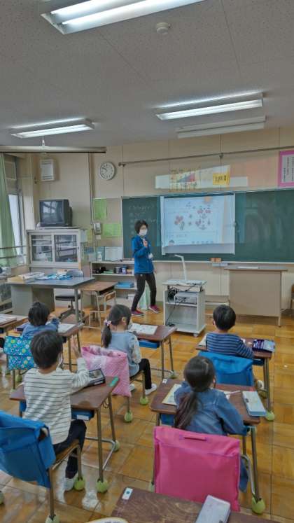 [1年生算数]1年生も本格的に教科学習が進んでいます。「4つのふうせん、4は2と2、4は3と1」先生と一緒に確かめます。
