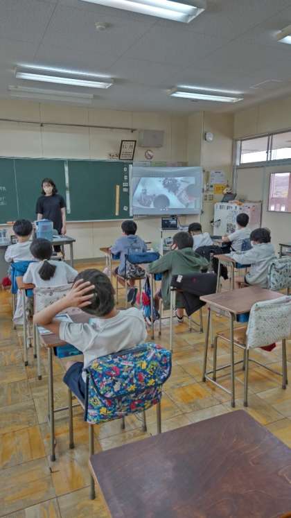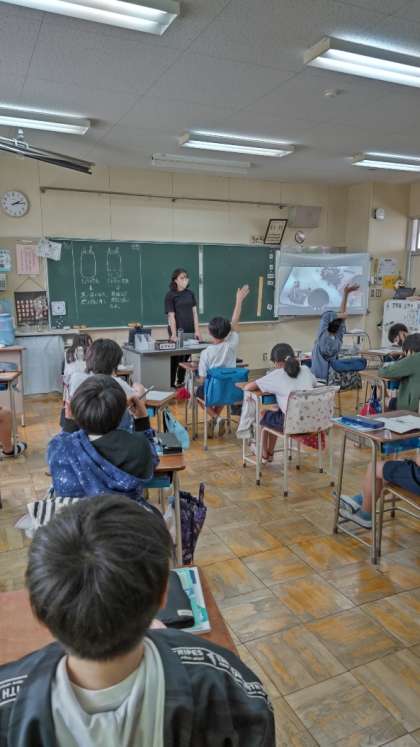 [6年生理科]前回の実験を振り返っています。入れ物の上だけ開いてる場合と、下にも穴が開いている場合の燃え方の違いを検証しています。