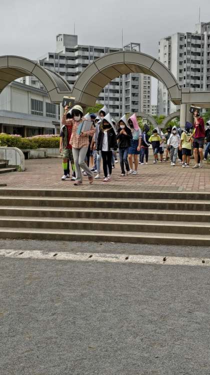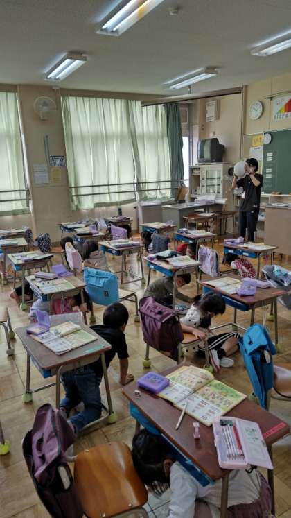 (避難開始!の合図で机から出てきます。今度は1年生の教室です)