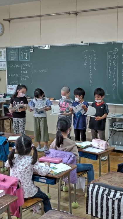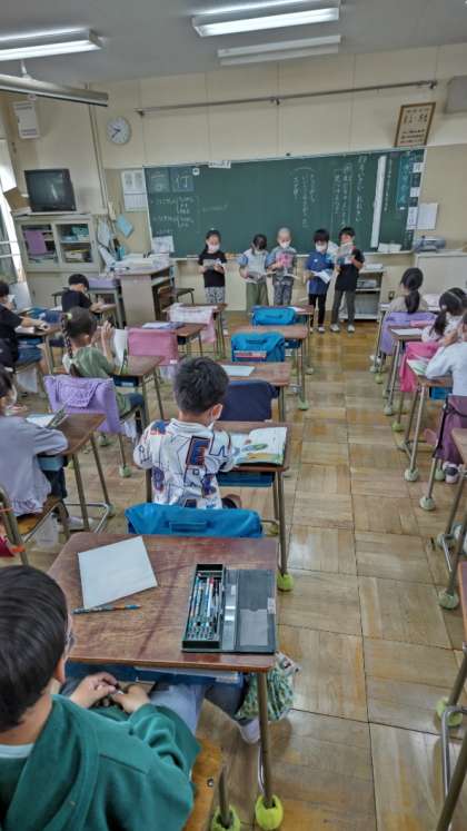 [2年生国語]詩「ちいさいおおきい」の音読発表会をしています。各班ごとの発表のようです。