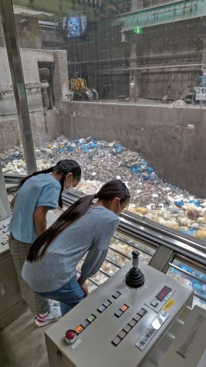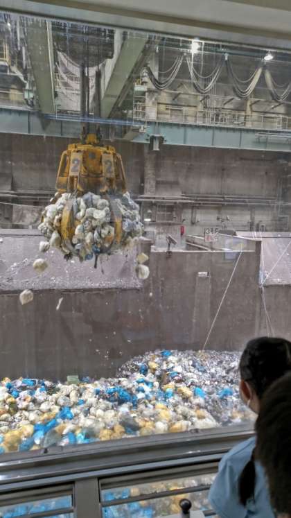 (ごみピットの深さは25m。巨大なごみクレーンがごみをわしづかみ)