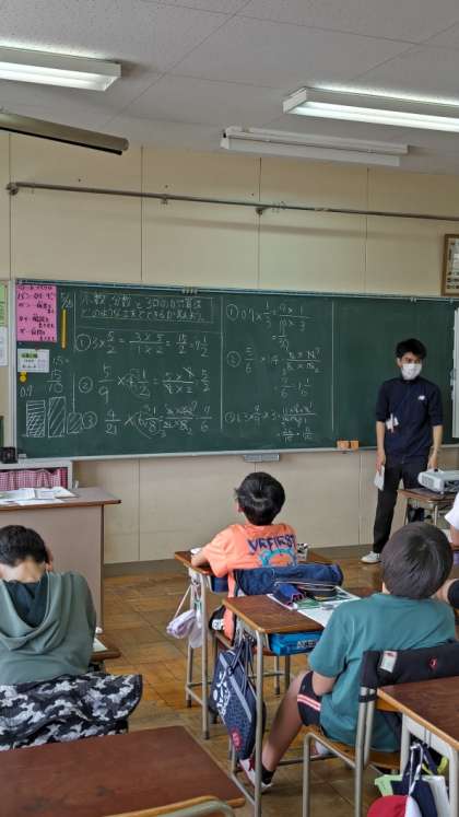 [6年生算数]教育実習生の先生が授業をしています。小数と分数が混じったかけ算のやり方です。