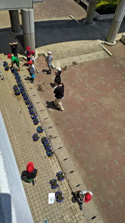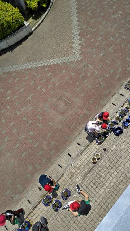[2年生生活]中庭から楽しそうな声が聞こえてきました。見れば2年生が何か植えています。