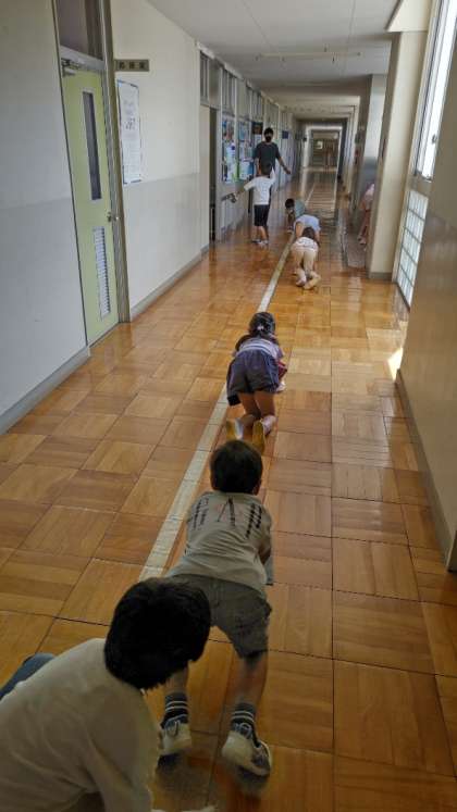 [2年生掃除]昼休み終わりのチャイムが鳴ると掃除の時間が始まります。校長室から一番近い2年生の教室前廊下でもすぐに雑巾がけの列ができます。