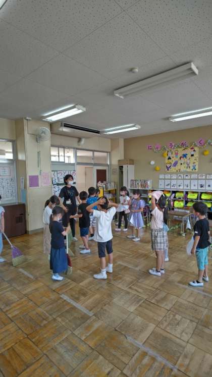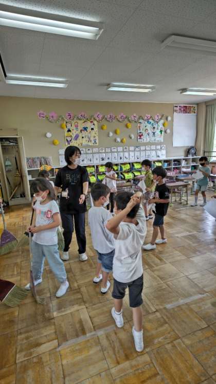 [1年生掃除]こちらの教室も掃除が始まったところです。「校長先生!ほら見て!」・・・「ゆか」「つくえ」と書かれた真新しい雑巾を見せてくれました。