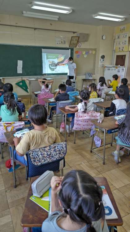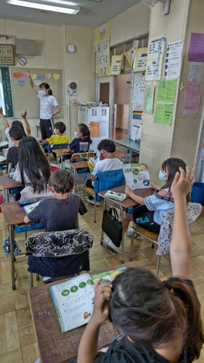 [3年生理科]「チョウを育てよう」の学習のまとめをしています。卵から幼虫、そしてさなぎになってから成虫になるチョウの成長を確かめています。