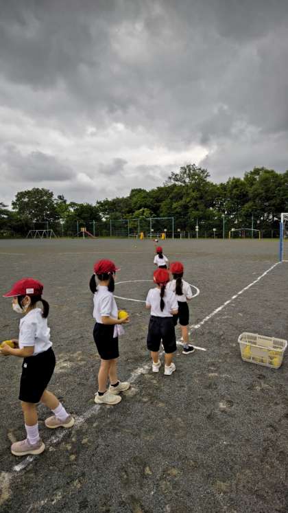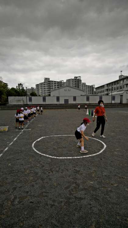 (今度は本番と同じように円の中から一人ずつ投げます。空は雨が降りそうな色をしていますが、降っていません)