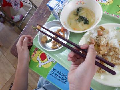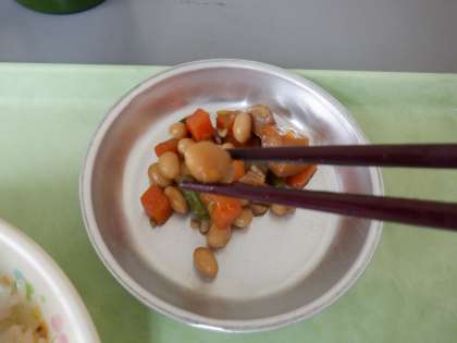とても上手に箸を使い、豆などをつまんでいる児童もいますが、まだまだ、箸の持ち方も苦手な児童もいます、すこしずつ練習しましょう。