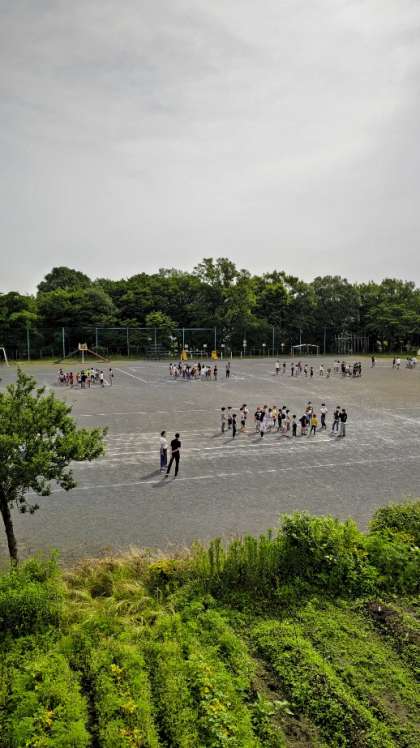 [たてわり班集会]今朝は校庭でたてわり班遊びをします。チャイムが鳴って、子供たちが班ごとに集まりました。