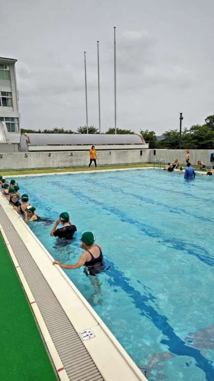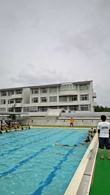 [3年生4年生体育]中学年の水泳指導です。さすがは中学年、おしゃべりはしません。先生のお話をしっかり聞いてます。