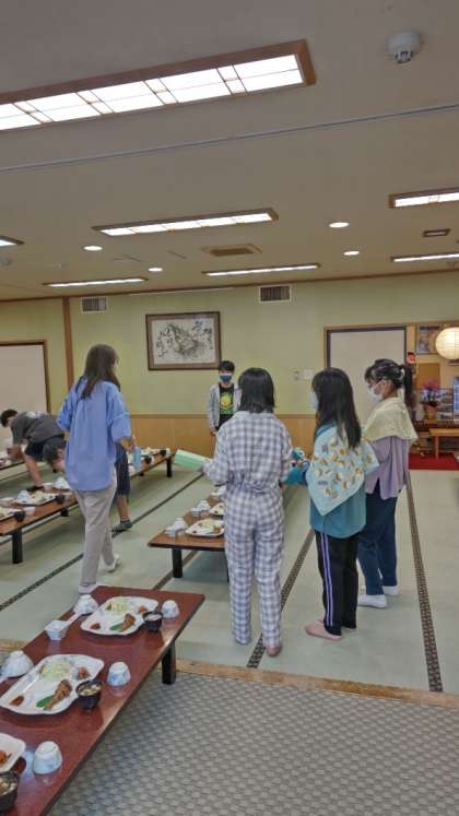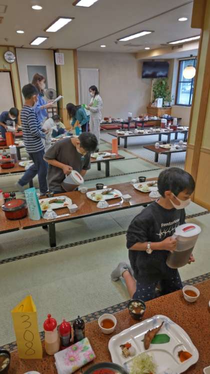 17:40 入浴が済んで食事係たちが夕食の準備をしています。もうすぐ宿舎ではじめての食事です。
