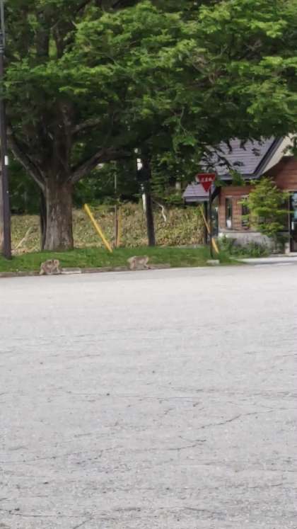 5:45 校長が朝の様子を見に行こうと思い、すぐ近くのバスロータリーへ行くと、猿が2匹散歩をしていました。小さく写っていますのでわかりますか。