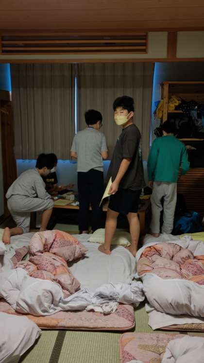 6:00 先生の館内放送でみんな起き始めました。まだ眠そうですね。早速朝の支度です。