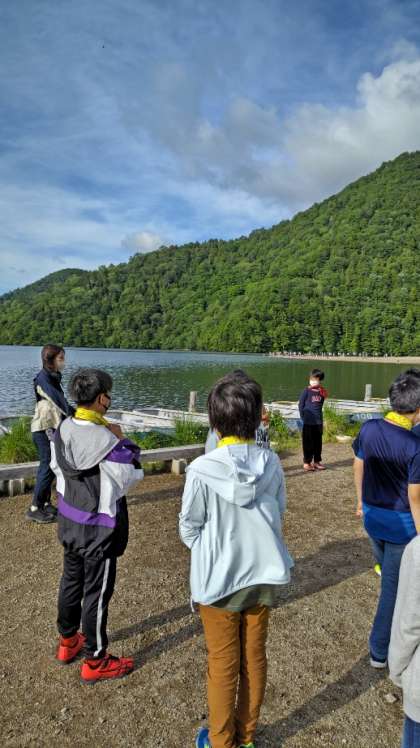 6:30 湯ノ湖の湖畔に歩いてきました。今朝はここで朝の会をします。