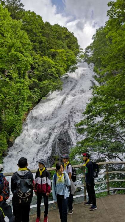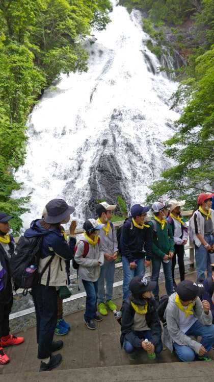 8:35 滑り落ちる豪快な滝、湯滝をバックに写真を撮ります。