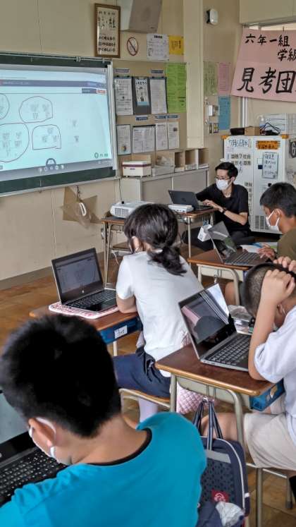 [6年生国語]「地域の防災について話し合おう」の学習です。タブレットを活用して意見を集約しています。