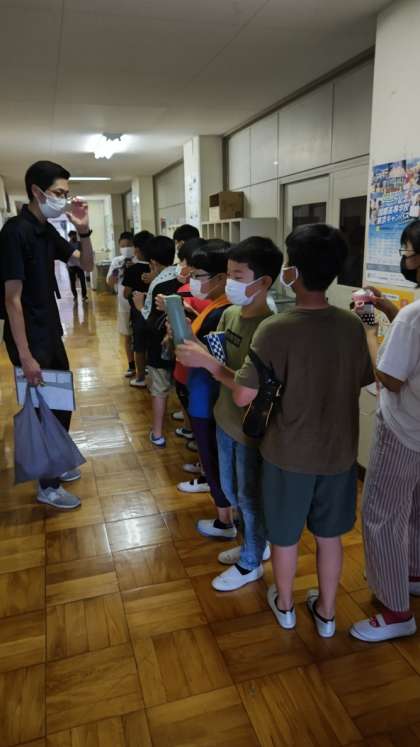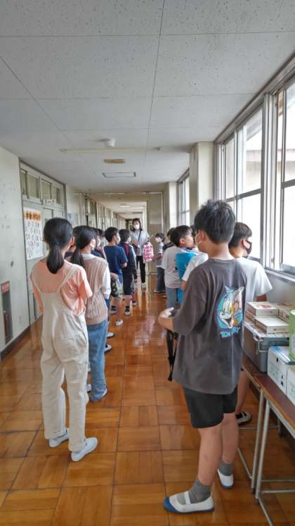(中学校の教室の前です、ちょっと緊張しているかな)