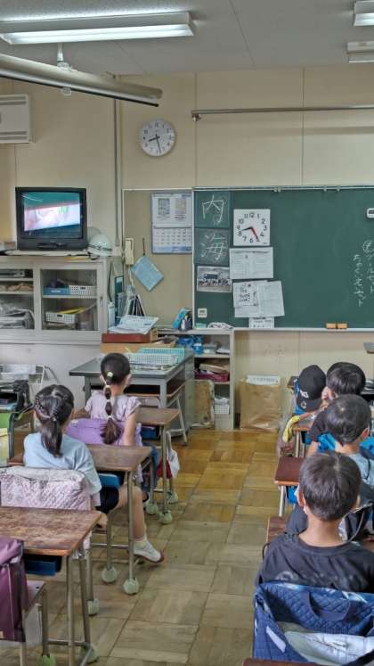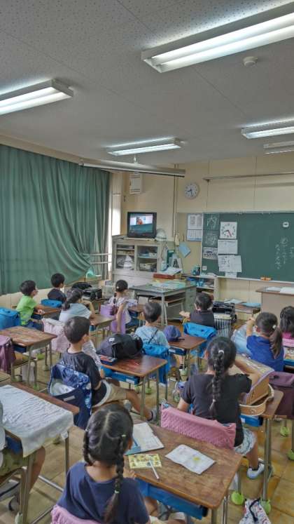 [全校テレビ朝会]今日はテレビ朝会です。不安や悩みを抱えた時に、身近にいる大人に相談することの大切さを伝える動画を見ています。写真は2年生の教室です。