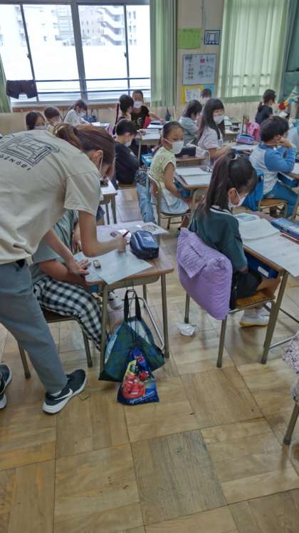 (ワークシートに思いを書くと、先生が回って「はなまる」をつけてくれます)