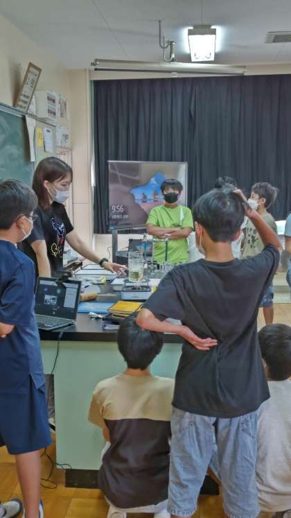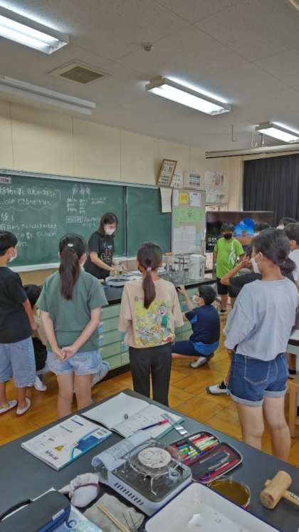 (先生の机を囲んで注意点を聞きます。安全第一)