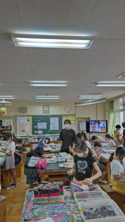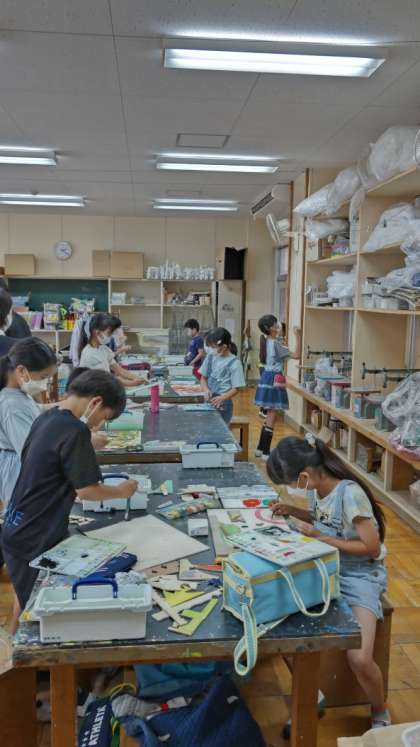 [5年生図工]今学期最後の図工とのことです。「でこぼこの絵」を仕上げています。糸のこぎりの端材を使って抽象的な表現にチャレンジです。