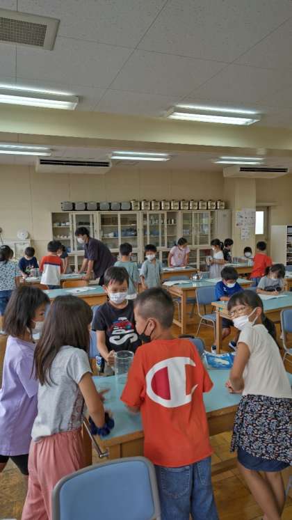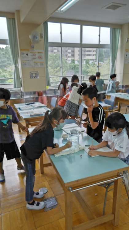 [2年生算数]「かさ」の学習の続きです。LとdLを学習している2年生、いろいろな入れ物に入るかさを予想してから実際に計っています。