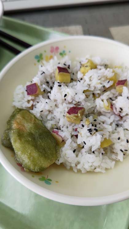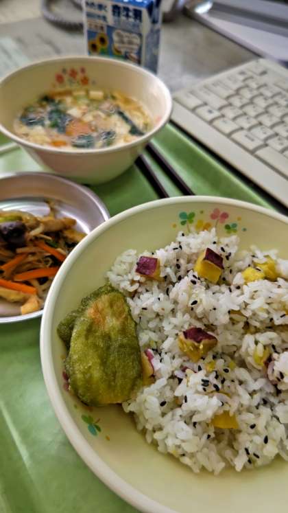 子供たちより少し早めに検食します。今日の給食は「さつまいもご飯」と「桑都あげ」です。笹かまぼこに桑の葉の粉をまぶして揚げたのが「桑都あげ」です。見た目もとってもきれいですし、何よりおいしかったです。