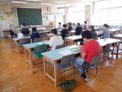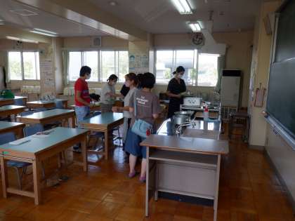 校長先生の挨拶と給食についての話を少ししてから、参加された方で協力し給食当番をしていただき給食を盛り付け、試食、片付け、アンケートの記入をしていただきました。