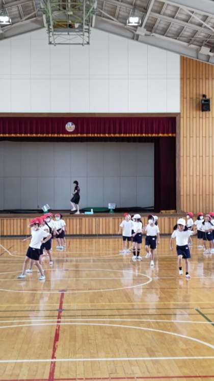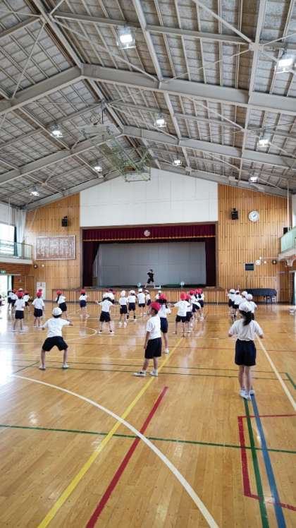 [1年生2年生体育]低学年が体育館に集合しました。運動会のダンスの練習です。