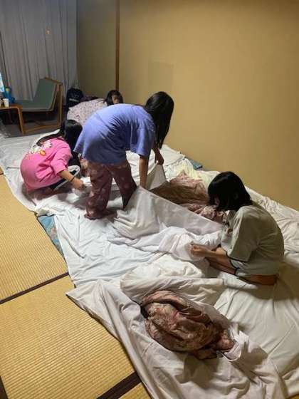 班長中心に布団を敷き、就寝準備です。