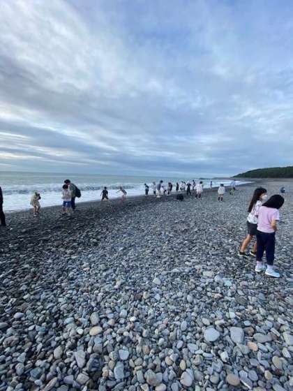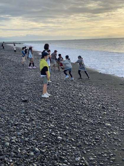 はちまき石を探したり、波から逃げたり、石を積み上げたりしています。