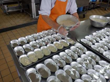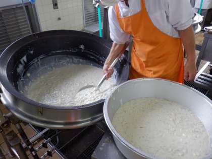 炒めた野菜とベーコンに別の釜で作ったホワイトルーを入れてグラタンの具を作ります。