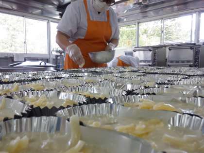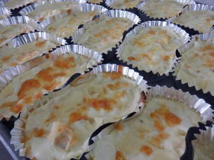 アルミカップに入れたらチーズをのせてコンベクションオーブンで焼き色がつくまで焼いてできあがりです。