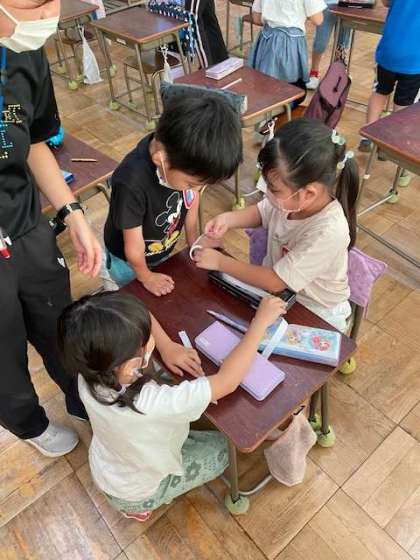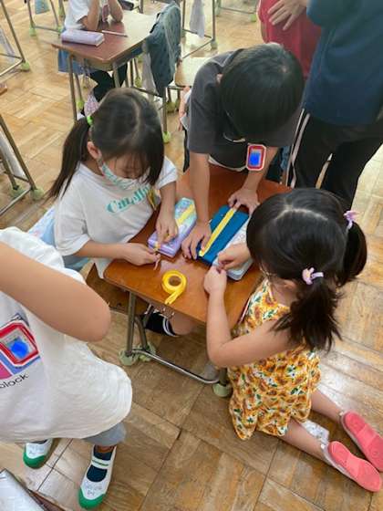 自分の筆箱の長さを紙テープて測りとり、友達と比べています。