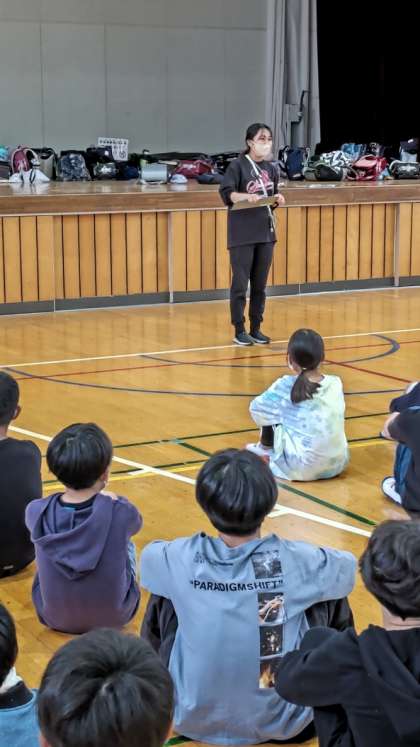 高学年の子供たち(応援団の4年生も)と職員で運動会の前日準備を始めます。まずは体育館に集合です。