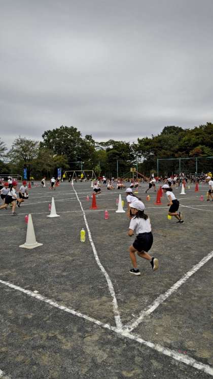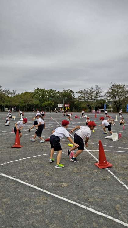 [中学年競技]「倒して起こして!チャレンジパーティ!」コーンやペットボトルを倒し合います。たくさん起こしたほうが勝ちです。
