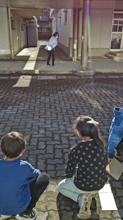 (たまたま通りかかった4年生の先生が「私を照らして!」・・・もちろん顔には当てません)