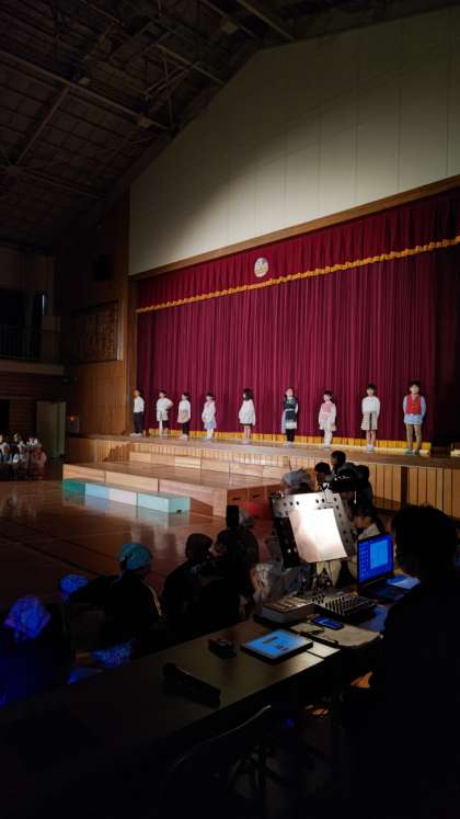 (幕間の中、早めにスタンバイした1年生2年生です。じっと待つ姿も立派です。さあ、がんばろう!)
