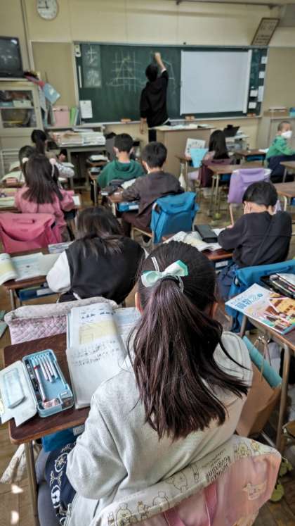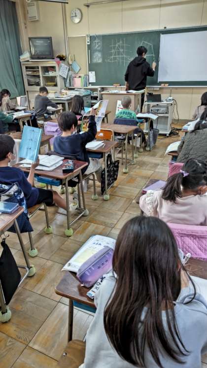[2年生算数]「三角形と四角形」の学習です。大きな三角形と四角形が黒板に書かれていますね。