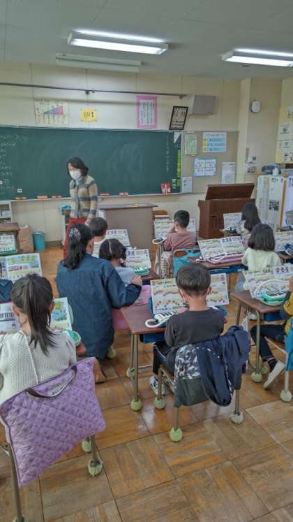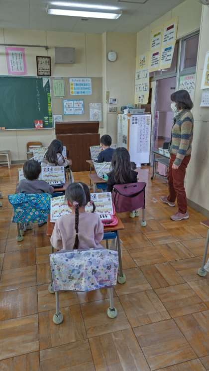 [1年生音楽]1年生が鍵盤ハーモニカを弾いています。上手に弾けたらシールを貼れるようです。