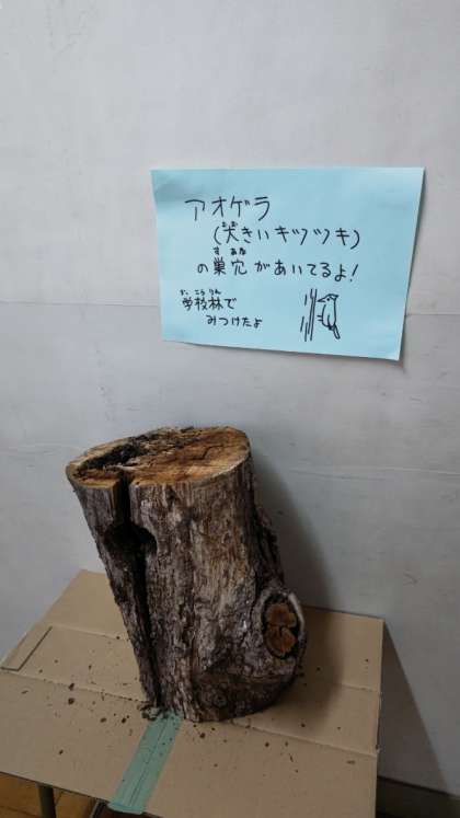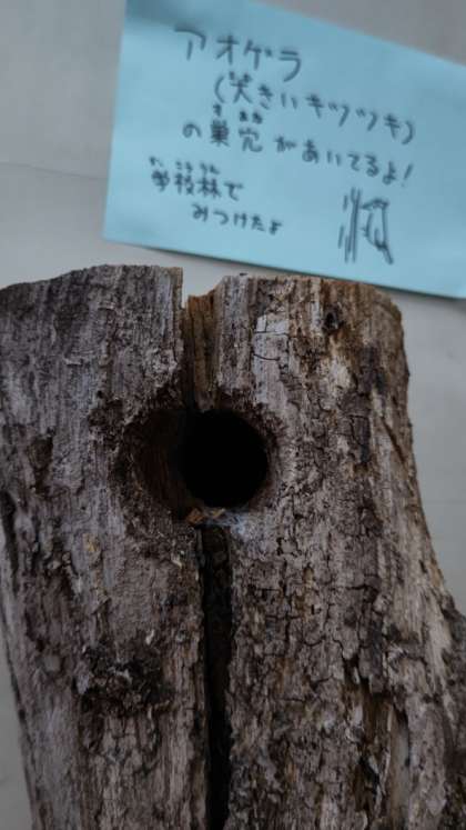 校長室前の廊下にはアオゲラ(キツツキ)の巣の跡が展示されています。学校運営協議会委員の方から教えていただいたものです。下柚木小の学校林にありました。すごいですね。子供たちが登下校の時によく観察しています。