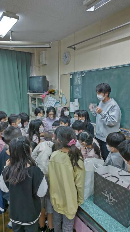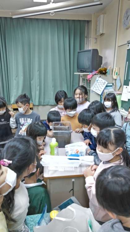 2年生の教室で、子供たちが全員教卓を取り囲み、水槽を見ています。保護者の方からいただいたメダカを、これから披露するようです。