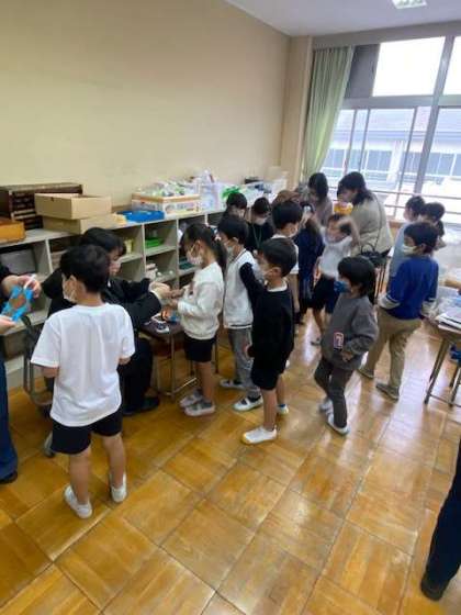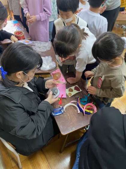 出来上がったラミネートをそれぞれ切ってもらい、選んだリボンを通して完成です。