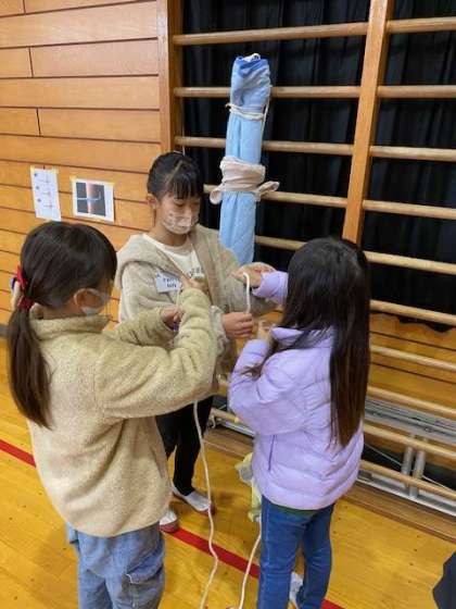 木にロープを巻くときには、木が傷まないように、タオルを巻いてから行います。