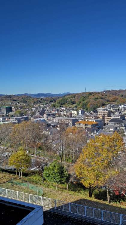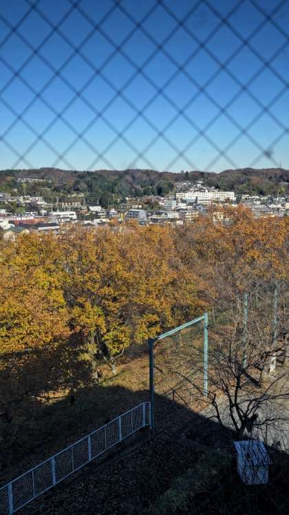よく晴れた冬の日です。高台の学校からは山の稜線がはっきり見えます。紅葉ももう終盤のようです。葉を落とした木々も目立つようになりました。